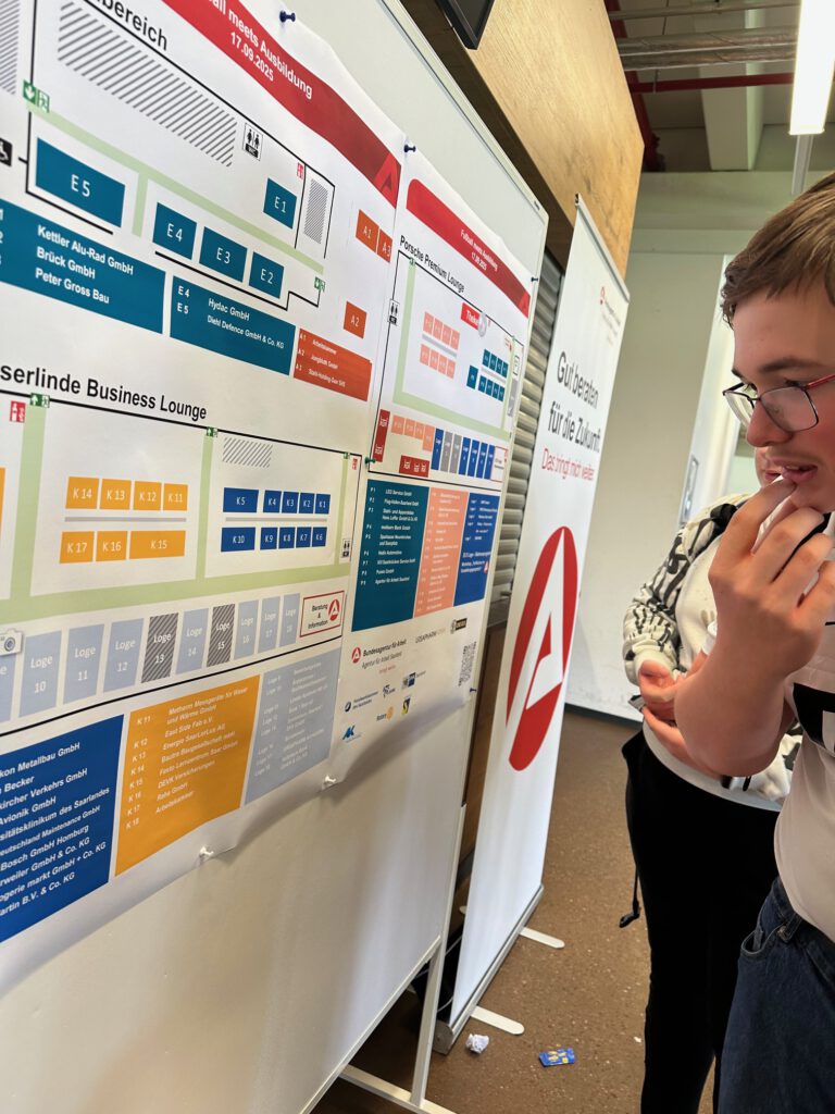 Die gesamte Klassenstufe 9 besuchte am 17.09. die Ausbildungsmesse „Fußball meets Ausbildung“ im Stadion des SV Elversberg an der Kaiserlinde. Es gab richtig viel zu entdecken bei 60 verschiedenen Firmen und Austellern. Die Schülerinnen und Schüler konnten sich an den Ständen über Ausbildungsmöglichkeiten informieren und erste Kontakte knüpfen. Außerdem gab es viele Mitmach-Angebote, besonders beliebt war der kleine „Sport-Test“ bei der Bundeswehr. Dort mussten die Schülerinnen und Schüler mit einer typischen Ausrüstung eines Soldaten Liegestütze machen. Ein besonderes Highlight war die Autogramm-Stunde mit zwei Spielern des SV Elversberg.